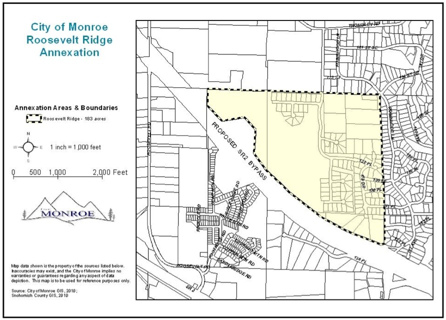 The Monroe City Council will hold a public hearing regarding the pre-annexation zoning for the proposed Roosevelt Ridge Annexation. This area is approximately 183 acres, and includes the Roosevelt Ridge Estates neighborhood along with a few larger parcels bordering the neighborhood. This annexation is subject to voter approval in the November 2012 election. Those registered voters living within the proposed annexation area will be eligible to vote in the annexation.